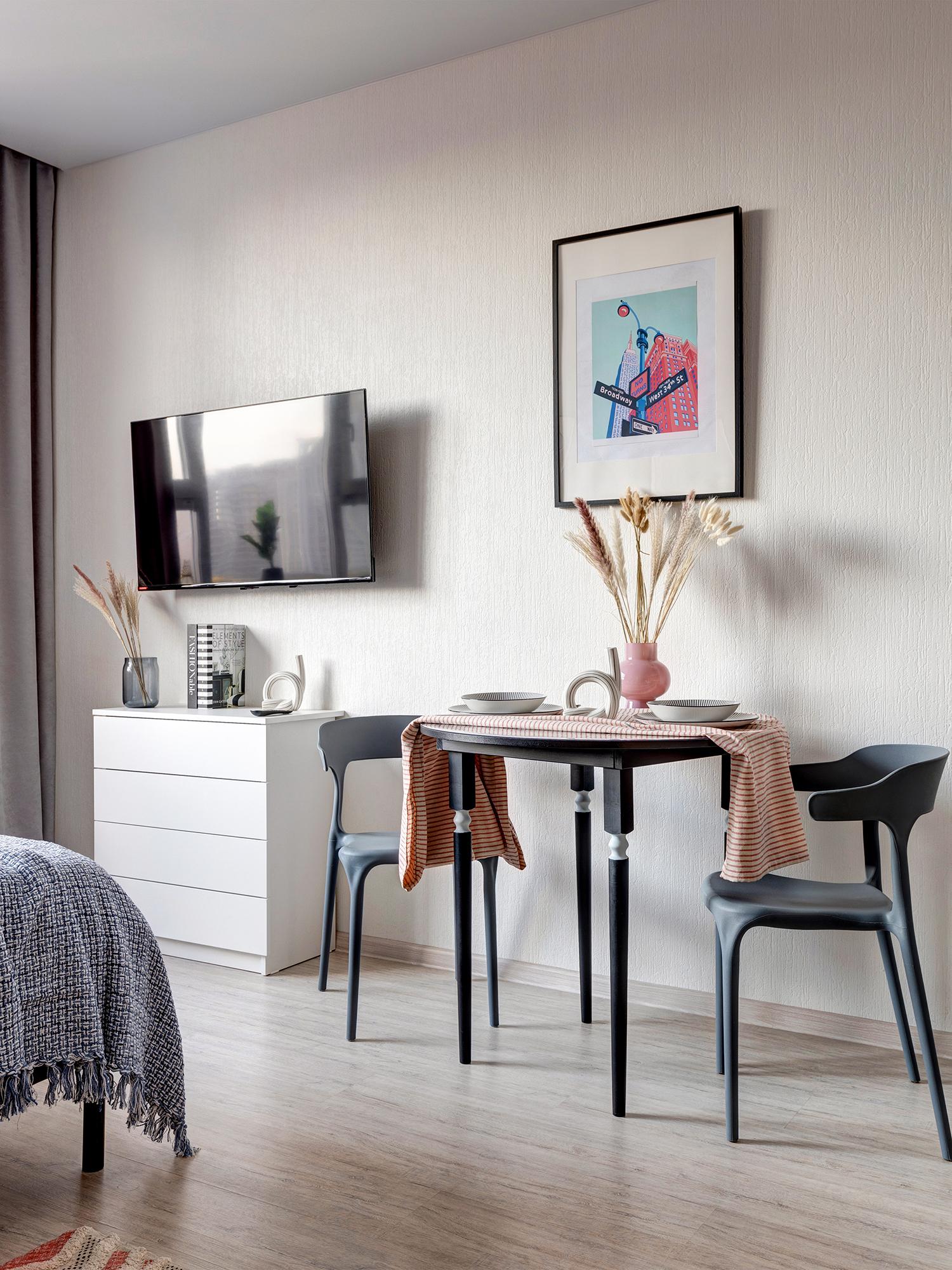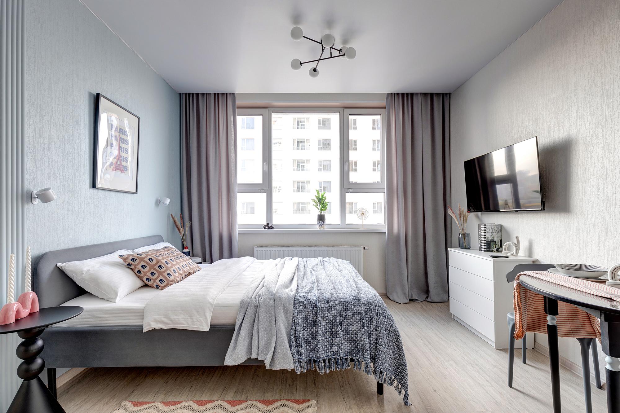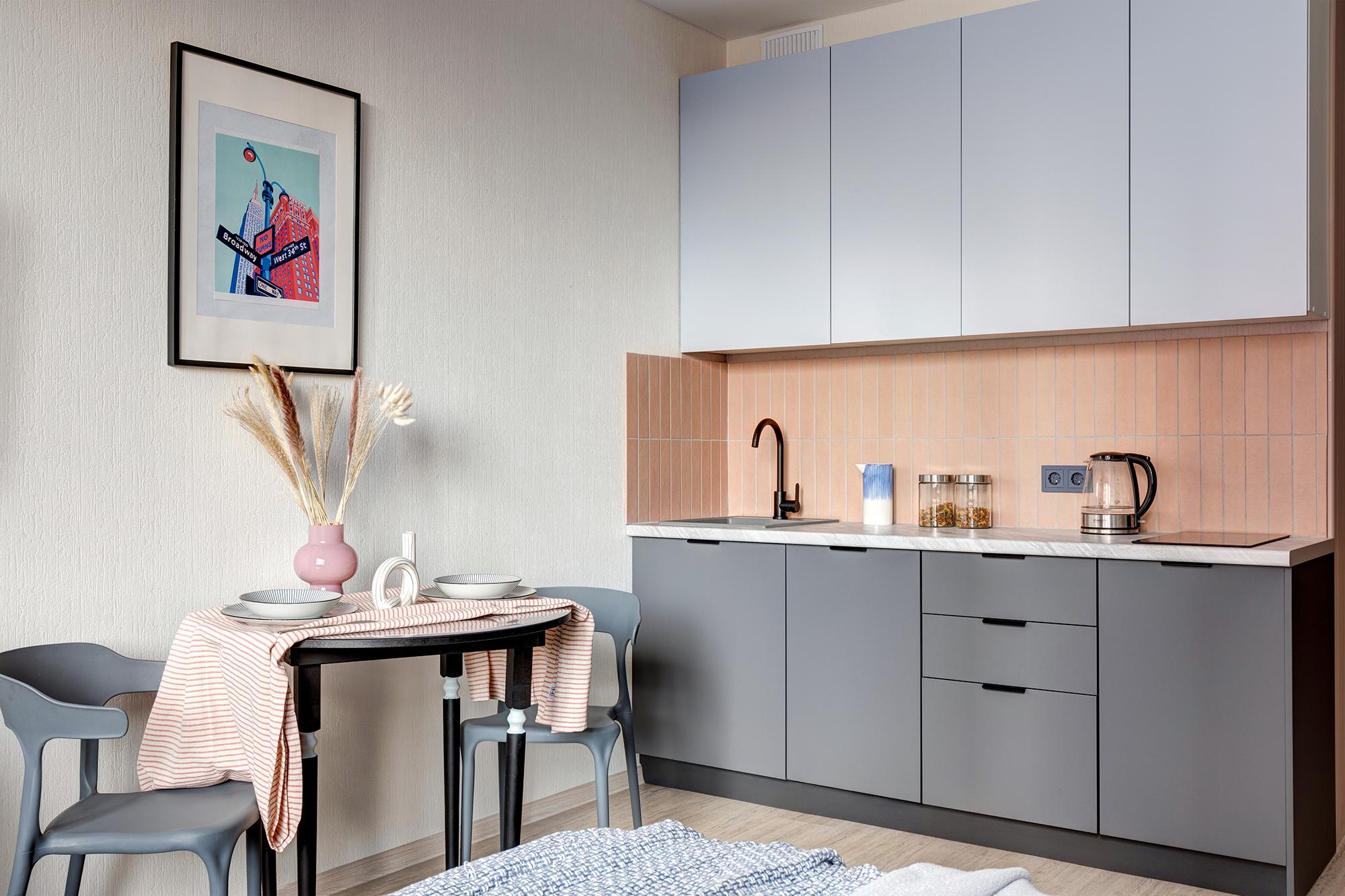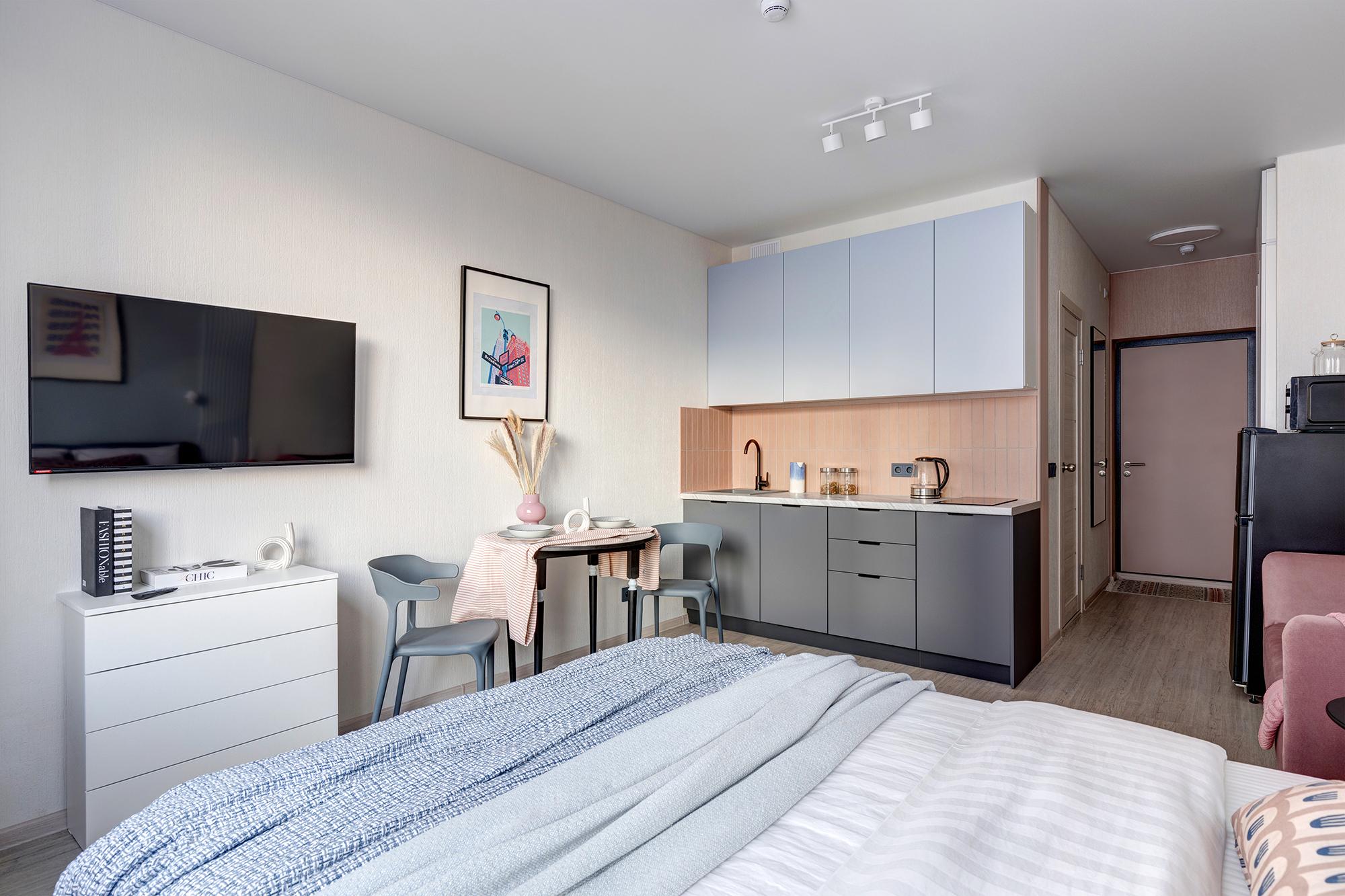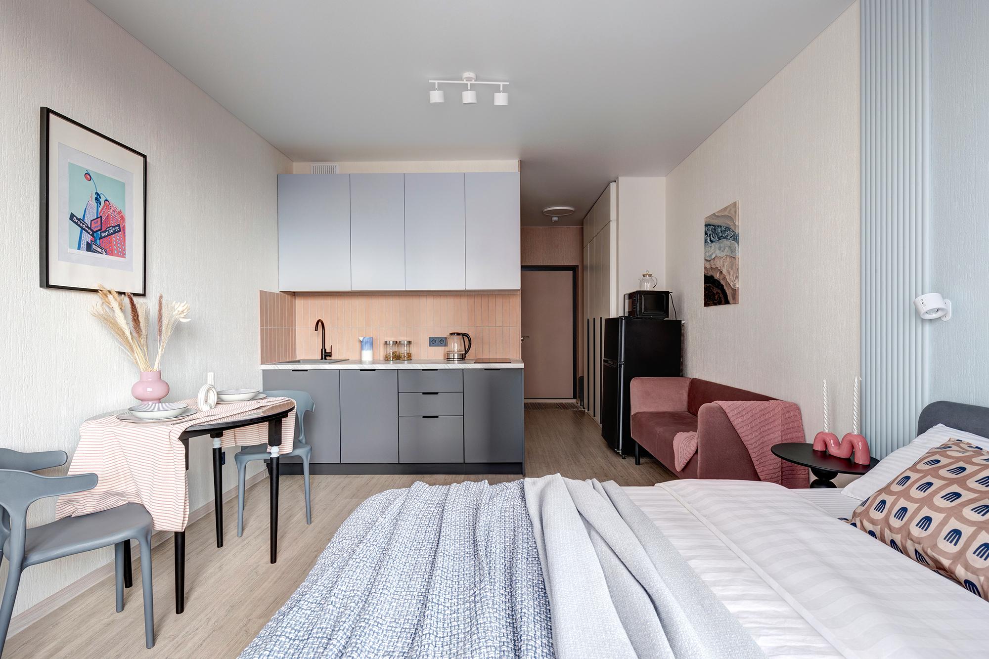 Современная квартира в серо-голубых тонах с лёгкими розовыми акцентами — пространство, где уют встречается с эстетикой. Большая кровать с качественным постельным бельём и полностью оборудованная кухня создают комфорт для отдыха и работы. Атмосфера минимализма и стильные детали делают её отличным выбором для деловой поездки или романтического уик-энда.