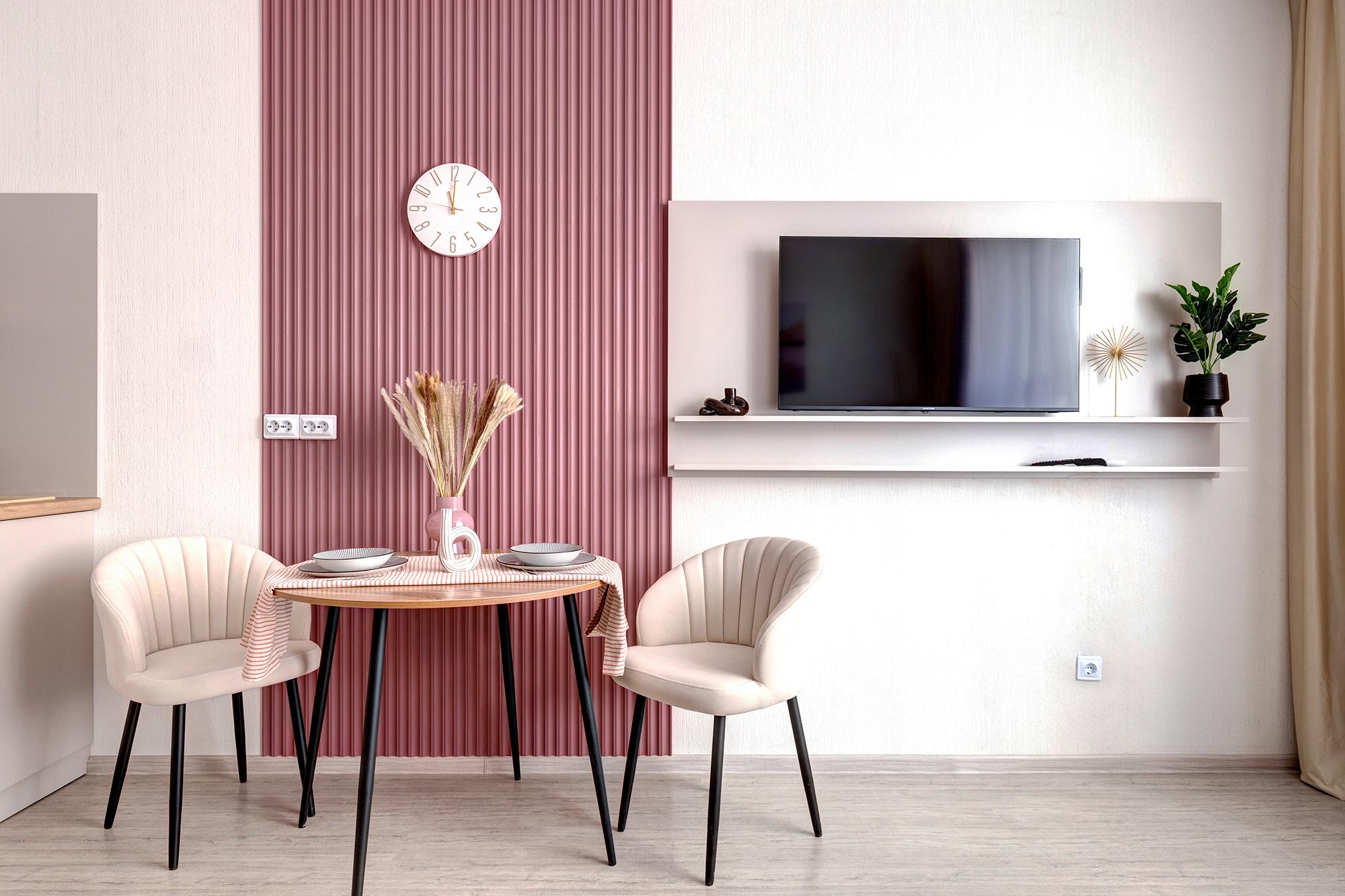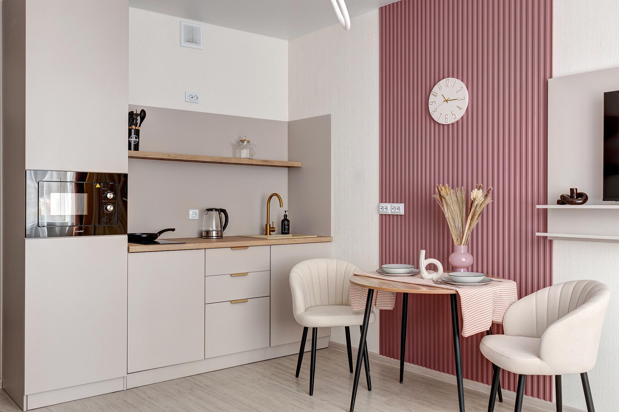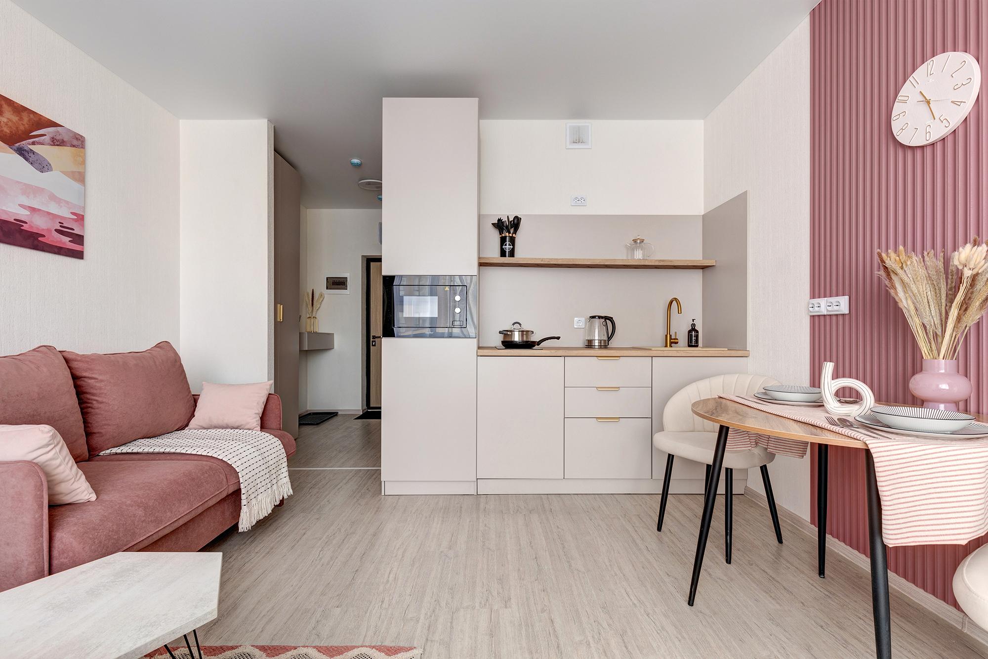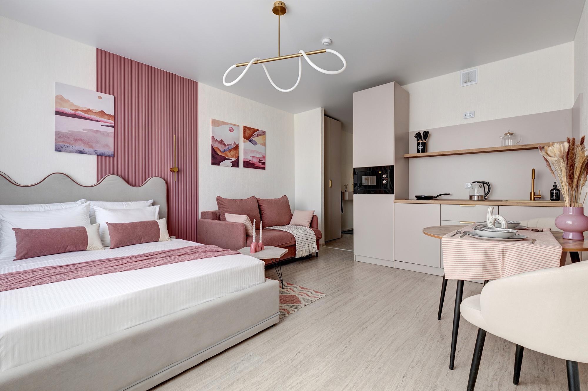 Эта квартира — воплощение нежности и уюта. Розовые акценты в интерьере, мягкий текстиль и гармоничный декор создают атмосферу романтики и лёгкости.Отличный выбор для девушек и пар, которые ищут атмосферное пространство для отдыха.